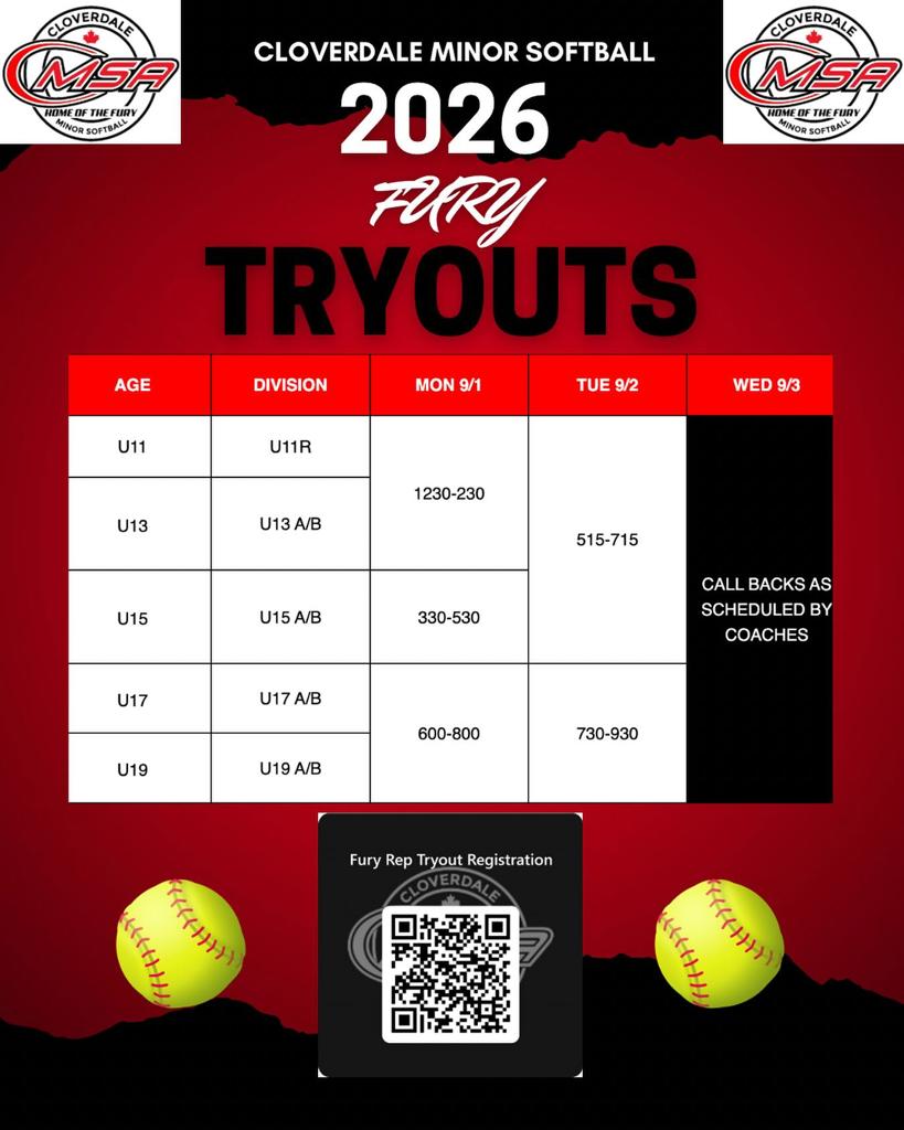 Inquiries regarding tryout schedules and registration can be sent to Sue at registrar@cloverdalesoftball.com